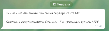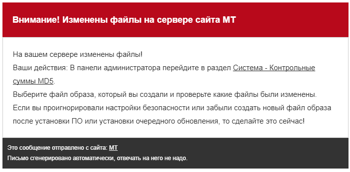 Якщо на вашому сервері будуть знайдені змінені або додані файли, то на системний E-mail адміна ви отримуватимете листи наступного змісту:
