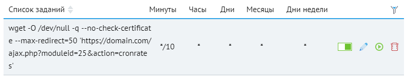 wget -O /dev/null -q --no-check-certificate --max-redirect=50 'https://domain.com/ajax.php?moduleid=25&action=cronrates'